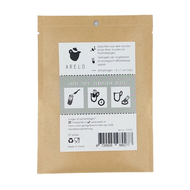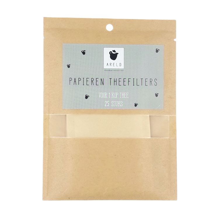 De filters zijn verpakt in een milieuvriendelijk kraftzakje met venster – praktisch en stijlvol voor op het aanrecht of in de theedoos.