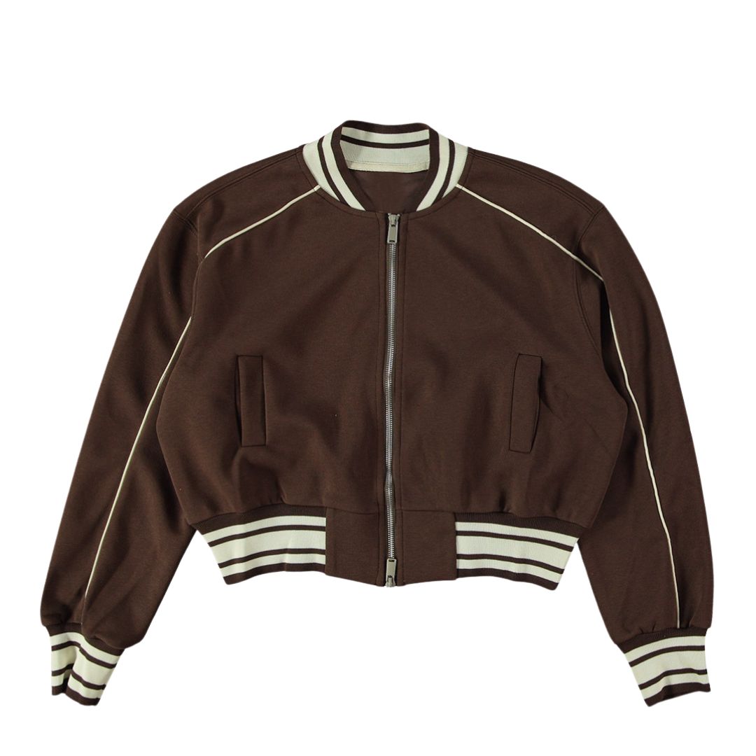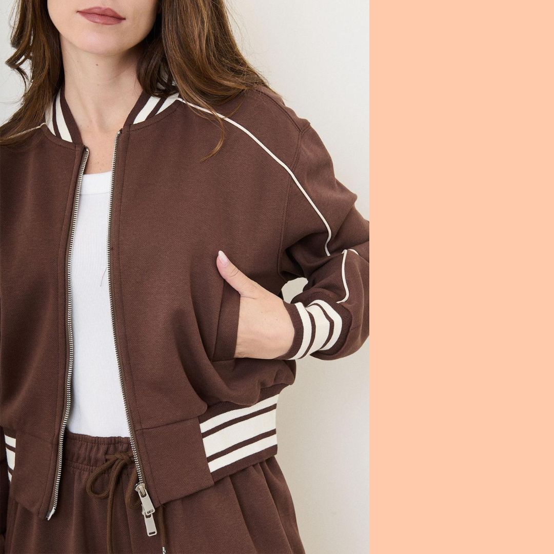Dit choco bruine bomberjack voor dames is dé perfecte mix van sportief en chic. De diepe chocoladebruine kleur geeft een warme, luxe uitstraling, terwijl de kortere pasvorm en de zwart-witte gestreepte boorden zorgen voor een moderne, casual look. Makkelijk te stylen en geschikt voor elk seizoen.