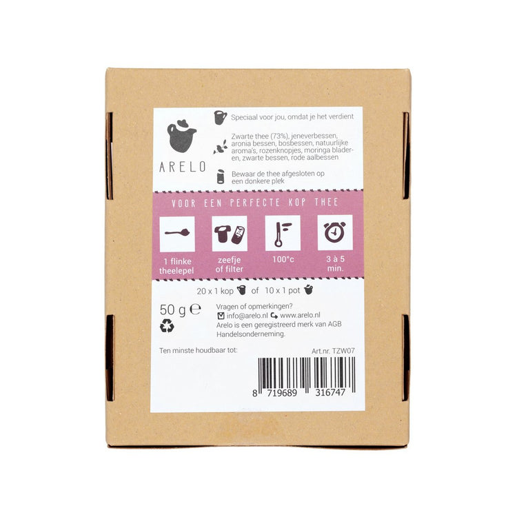 Soms zegt een kopje thee meer dan duizend woorden. Deze Dank je thee is een warme, fruitige manier om iemand oprecht te bedanken. De krachtige basis van zwarte thee wordt verrijkt met een rijke mix van bessen zoals jeneverbessen, aroniabessen, bosbessen, zwarte bessen en rode aalbessen. Rozenknopjes en moringa geven de blend een verfijnde, zachte twist.