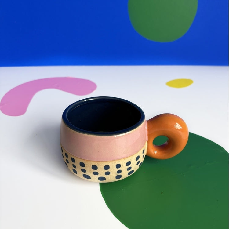 Instant Scandinavische vibes met dit schattige kopje. De looks dankt het kopje aan z'n naturel uitstraling, omdat het deels niet geglazuurd is. De binnenzijde is geglazuurd blauw en dus prima geschikt voor een warm drankje. Het oortje heeft de vorm van een donut, wat het kopje extra cute maakt. Ieder kopje is trouwens uniek, omdat ze handbeschilderd zijn.