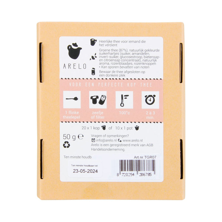 Groene thee (83%), natuurlijk gekleurde suikerhartjes (suiker, amandelen, invertsuiker, glucosestroop, bietensapextract, citroensap concentraat), rozenblaadjes, natuurlijk aroma, rozenknopjes Kan sporen bevatten van andere noten.