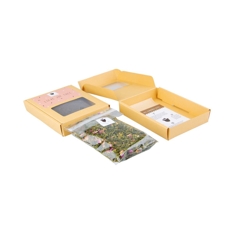 Deze thee is een feest om te geven en te krijgen, verpakt per 50 gram en inclusief drie papieren theefilters, zodat je meteen kunt genieten van een liefdevol kopje.