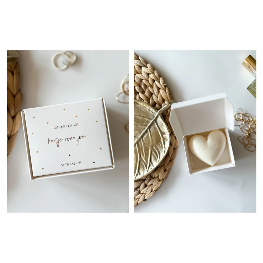Ontdek het allerliefste zeepje, doordrenkt met de fijne en verfrissende geur van onze huisparfum Vetiver. Dit unieke hartvormige zeepje van 115 gram komt prachtig verpakt in een schattig doosje, versierd met gouden hartjesfolie – een cadeau dat je met liefde geeft én ontvangt.
