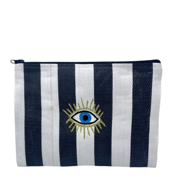 Op de voorkant schittert een prachtig geborduurd mystiek oog met metalen details, dat symbool staat voor bescherming en intuïtie. Het zakje is compact maar veelzijdig en kan worden gebruikt als make-uptasje, reisportemonnee, of zelfs om een natte bikini in op te bergen na een dag aan het strand.