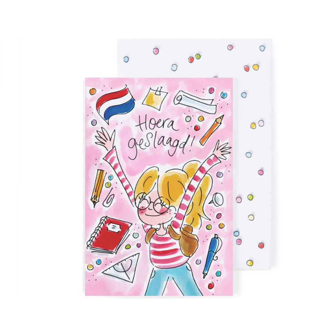 Natuurlijk wordt elke kaart geleverd met een bijpassende vrolijke envelop, zodat je jouw wens stijlvol én compleet kunt versturen. Het herkenbare, handgetekende Blond Amsterdam-design zorgt direct voor een lach op het gezicht van de ontvanger.